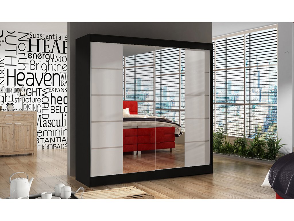 Skříň je vyrobena z kvalitního lamina. Díky svému vnitřnímu uspořádání nabízí dostatek úložného prostoru, posuvné dveře šetří prostor a zrcadlo ho opticky zvětšuje. Skříň je vhodná do ložnice, dětského nebo studentského pokoje, do předsíně i kanceláře. Vnitřní uspořádání skříně je vyobrazeno na fotografii. Skříň je dodávána v demontu. Součástí jsou i skleněná zrcadla, která jsou nalepena na dveřích skříně a také montážní plánek včetně všech potřebných spojovacích materiálů. Vyobrazené dekorace nejsou v ceně.