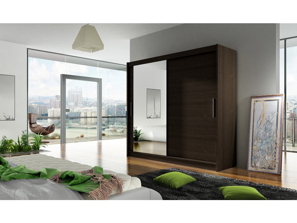 Skříň Berger s posuvnými dveřmi, je vyrobena z kvalitního lamina o síle 16 mm a hrany jsou ukončeny ABS lištou. Vodící lišty jsou vyrobeny z odolného hliníku a splňují požadavky pro každodenní užívání. Skříň je doplněna zrcadlem, které jí dodává elegantní vzhled a místnost opticky zvětší a prosvětlí. Nabízíme ji ve čtyřech odstínech. Díky svým rozměrům a uspořádání poskytuje dostatek úložného prostoru. Skříň je dodávána v demontu a součástí je montážní plánek včetně všech potřebných spojovacích materiálů. Vyobrazené dekorace nejsou v ceně. Skleněné zrcadlo je součástí skříně.