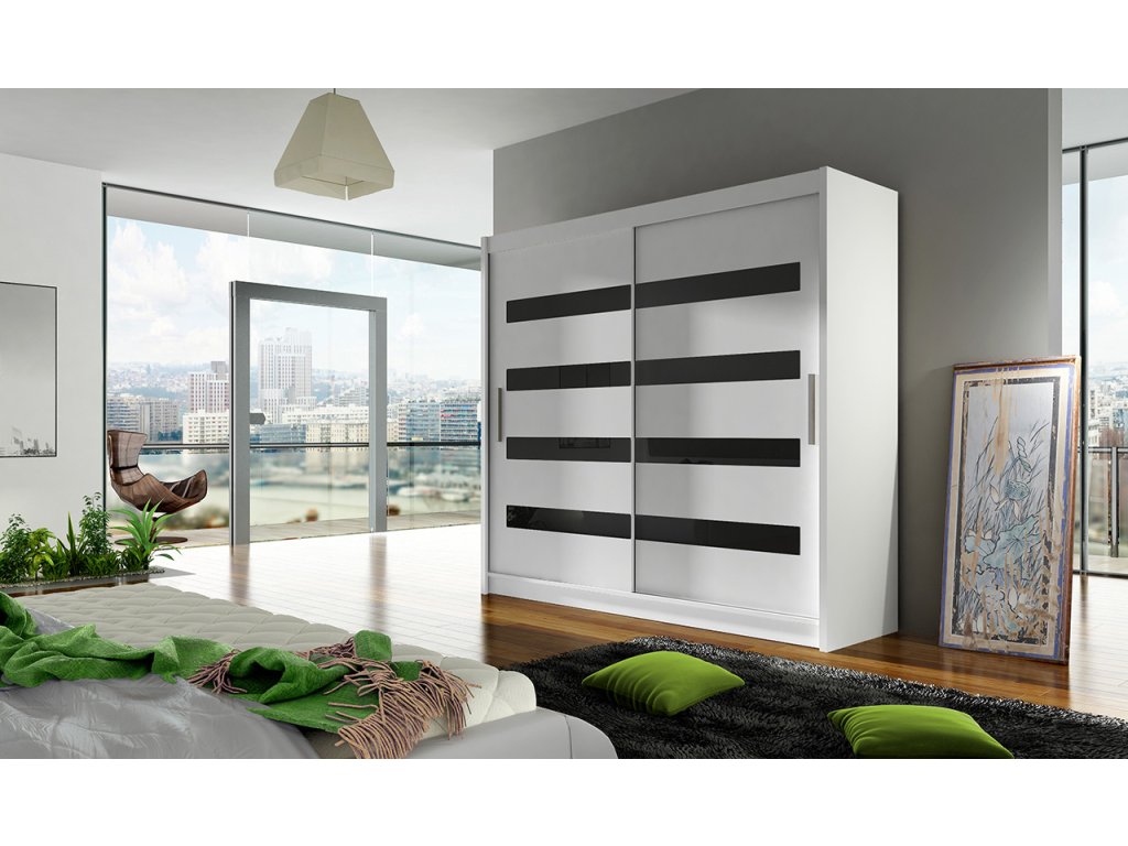 Skříň Berger s posuvnými dveřmi, je vyrobena z kvalitního lamina o síle 16 mm a hrany jsou ukončeny ABS lištou. Vodící lišty jsou vyrobeny z odolného hliníku a splňují požadavky pro každodenní užívání. Skříň je doplněna černými pruhy v lesku, které jí dodávají elegantní vzhled . Skříň díky svým rozměrům a uspořádání poskytuje dostatek úložného prostoru. Je dodávána v demontu a součástí je montážní plánek včetně všech potřebných spojovacích materiálů. Vyobrazené dekorace nejsou v ceně.