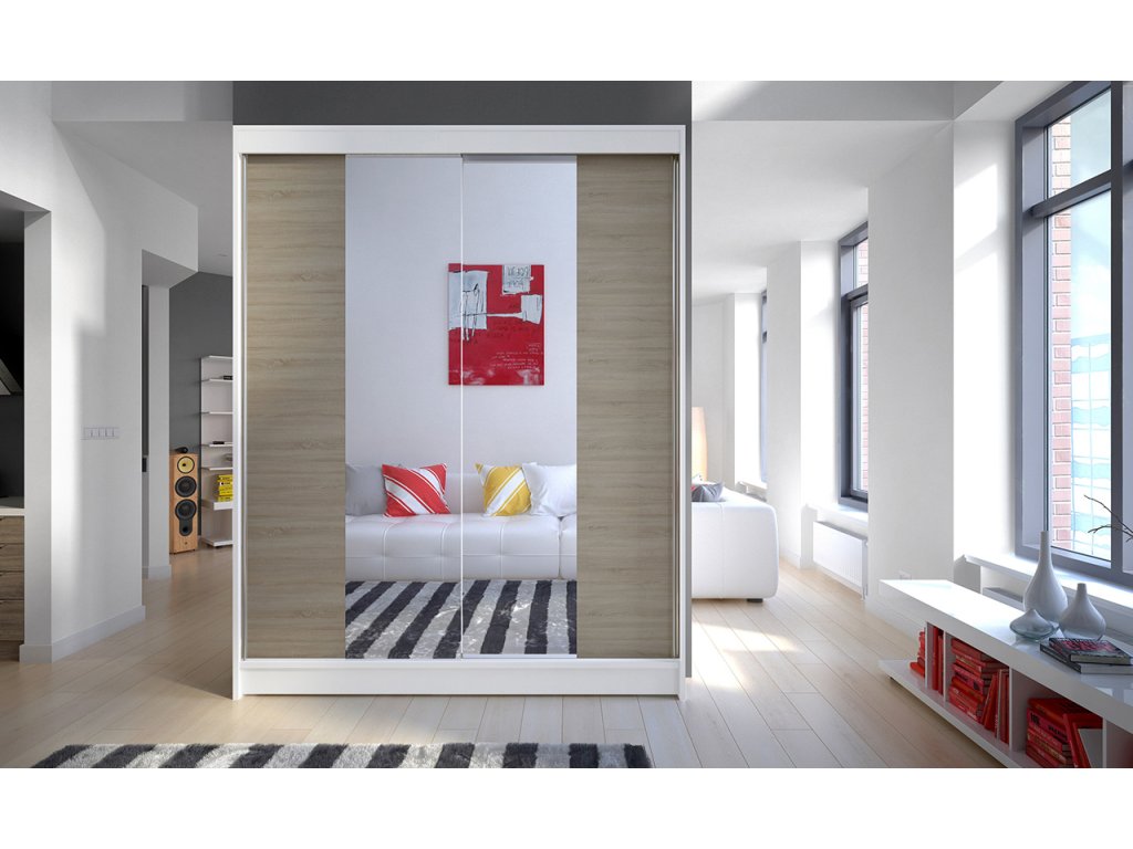 Skříň je vyrobena z kvalitního lamina. Díky svému vnitřnímu uspořádání nabízí dostatek úložného prostoru, posuvné dveře šetří prostor a zrcadlo ho opticky zvětšuje. Skříň je vhodná do ložnice, dětského nebo studentského pokoje, do předsíně i kanceláře. Vnitřní uspořádání skříně je vyobrazeno na fotografii. Skříň je dodávána v demontu. Součástí jsou i skleněná zrcadla, která jsou nalepena na dveřích skříně a také montážní plánek včetně všech potřebných spojovacích materiálů. Vyobrazené dekorace nejsou v ceně.