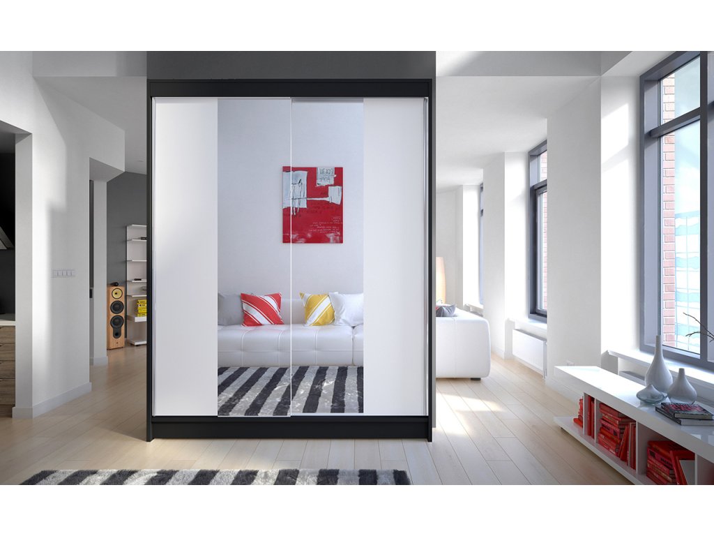 Skříň je vyrobena z kvalitního lamina. Díky svému vnitřnímu uspořádání nabízí dostatek úložného prostoru, posuvné dveře šetří prostor a zrcadlo ho opticky zvětšuje. Skříň je vhodná do ložnice, dětského nebo studentského pokoje, do předsíně i kanceláře. Vnitřní uspořádání skříně je vyobrazeno na fotografii. Skříň je dodávána v demontu. Součástí jsou i skleněná zrcadla, která jsou nalepena na dveřích skříně a také montážní plánek včetně všech potřebných spojovacích materiálů. Vyobrazené dekorace nejsou v ceně.