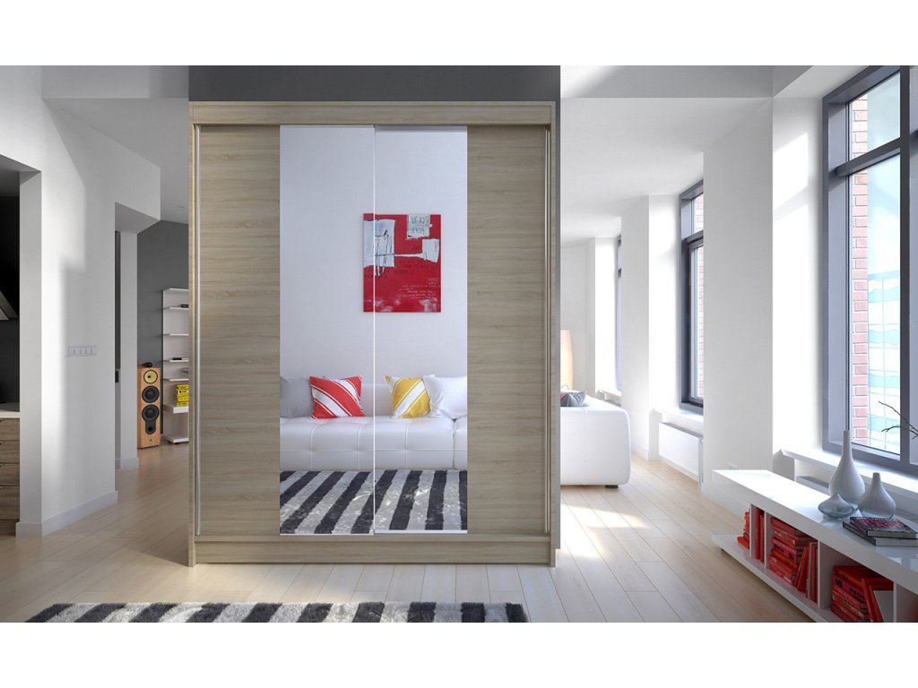 Skříň je vyrobena z kvalitního lamina. Díky svému vnitřnímu uspořádání nabízí dostatek úložného prostoru, posuvné dveře šetří prostor a zrcadlo ho opticky zvětšuje. Skříň je vhodná do ložnice, dětského nebo studentského pokoje, do předsíně i kanceláře. Vnitřní uspořádání skříně je vyobrazeno na fotografii. Skříň je dodávána v demontu. Součástí jsou i skleněná zrcadla, která jsou nalepena na dveřích skříně a také montážní plánek včetně všech potřebných spojovacích materiálů. Vyobrazené dekorace nejsou v ceně.