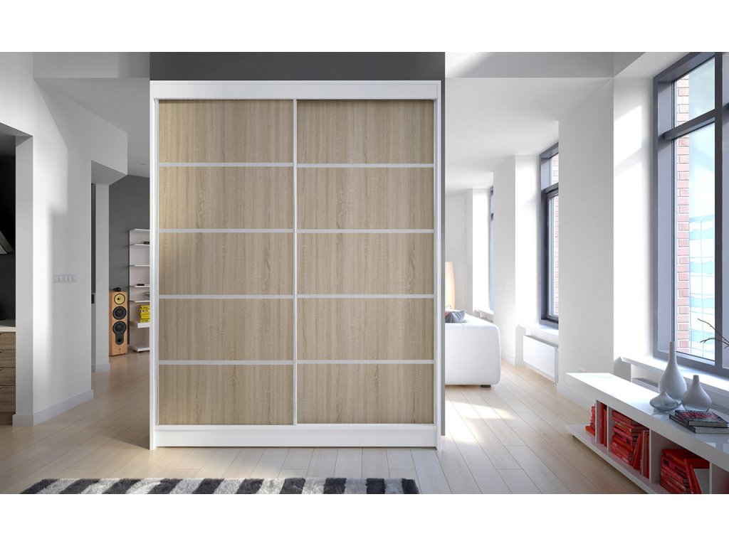 Skříň je vyrobena z kvalitního lamina. Díky svému vnitřnímu uspořádání nabízí dostatek úložného prostoru a posuvné dveře prostor šetří. Skříň je vhodná do ložnice, dětského nebo studentského pokoje, do předsíně i kanceláře. Vnitřní uspořádání skříně je vyobrazeno na fotografii. Skříň je dodávána v demontu a součástí je montážní plánek včetně všech potřebných spojovacích materiálů. Vyobrazené dekorace nejsou v ceně.