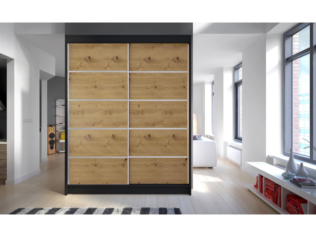 Skříň je vyrobena z kvalitního lamina. Díky svému vnitřnímu uspořádání nabízí dostatek úložného prostoru a posuvné dveře prostor šetří. Skříň je vhodná do ložnice, dětského nebo studentského pokoje, do předsíně i kanceláře. Vnitřní uspořádání skříně je vyobrazeno na fotografii. Skříň je dodávána v demontu a součástí je montážní plánek včetně všech potřebných spojovacích materiálů. Vyobrazené dekorace nejsou v ceně.