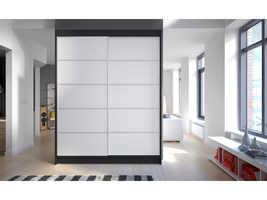 Skříň je vyrobena z kvalitního lamina. Díky svému vnitřnímu uspořádání nabízí dostatek úložného prostoru a posuvné dveře prostor šetří. Skříň je vhodná do ložnice, dětského nebo studentského pokoje, do předsíně i kanceláře. Vnitřní uspořádání skříně je vyobrazeno na fotografii. Skříň je dodávána v demontu a součástí je montážní plánek včetně všech potřebných spojovacích materiálů. Vyobrazené dekorace nejsou v ceně.