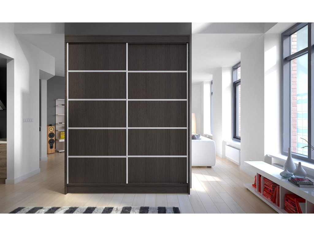Skříň je vyrobena z kvalitního lamina. Díky svému vnitřnímu uspořádání nabízí dostatek úložného prostoru a posuvné dveře prostor šetří. Skříň je vhodná do ložnice, dětského nebo studentského pokoje, do předsíně i kanceláře. Vnitřní uspořádání skříně je vyobrazeno na fotografii. Skříň je dodávána v demontu a součástí je montážní plánek včetně všech potřebných spojovacích materiálů. Vyobrazené dekorace nejsou v ceně.