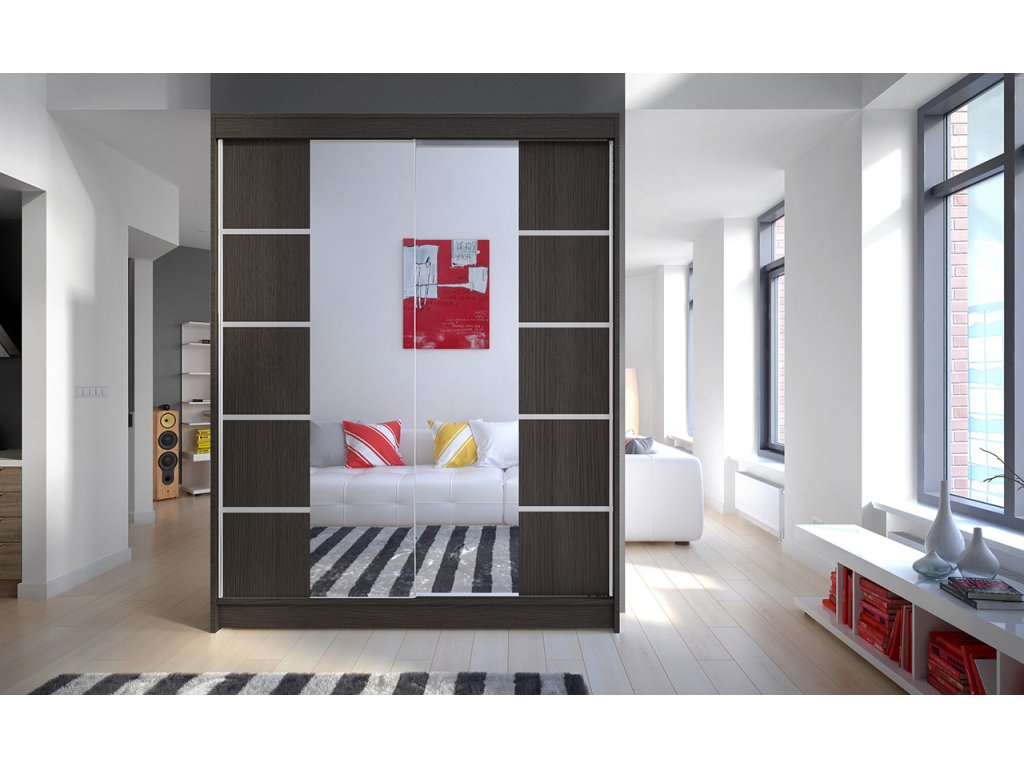 Skříň je vyrobena z kvalitního lamina. Díky svému vnitřnímu uspořádání nabízí dostatek úložného prostoru, posuvné dveře šetří prostor a zrcadlo ho opticky zvětšuje. Skříň je vhodná do ložnice, dětského nebo studentského pokoje, do předsíně i kanceláře. Vnitřní uspořádání skříně je vyobrazeno na fotografii. Skříň je dodávána v demontu. Součástí jsou i skleněná zrcadla, která jsou nalepena na dveřích skříně a také montážní plánek včetně všech potřebných spojovacích materiálů. Vyobrazené dekorace nejsou v ceně.