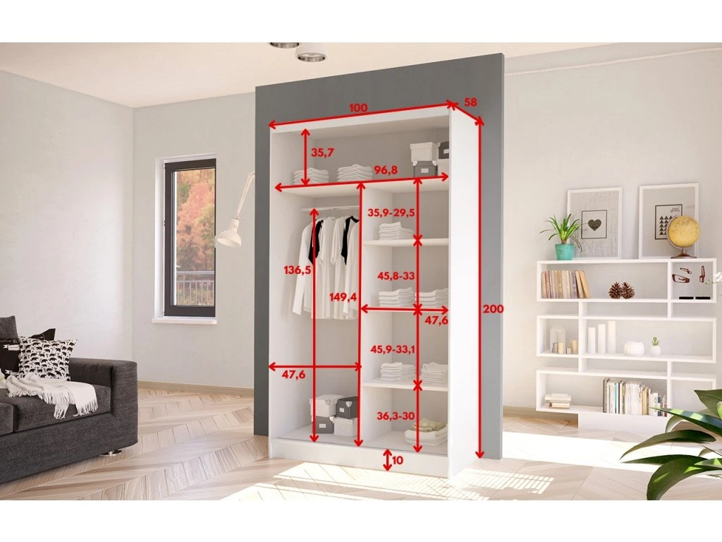 Šatní skříň Diem IV v moderním designu má šířku 100 cm a je rozdělena na dvě praktické části. Posuvné dveře šetří místo a usnadňují přístup do interiéru. Vnitřní uspořádání kombinuje závěsnou tyč a čtyři police, což umožňuje přehledné a praktické rozdělení šatníku.
