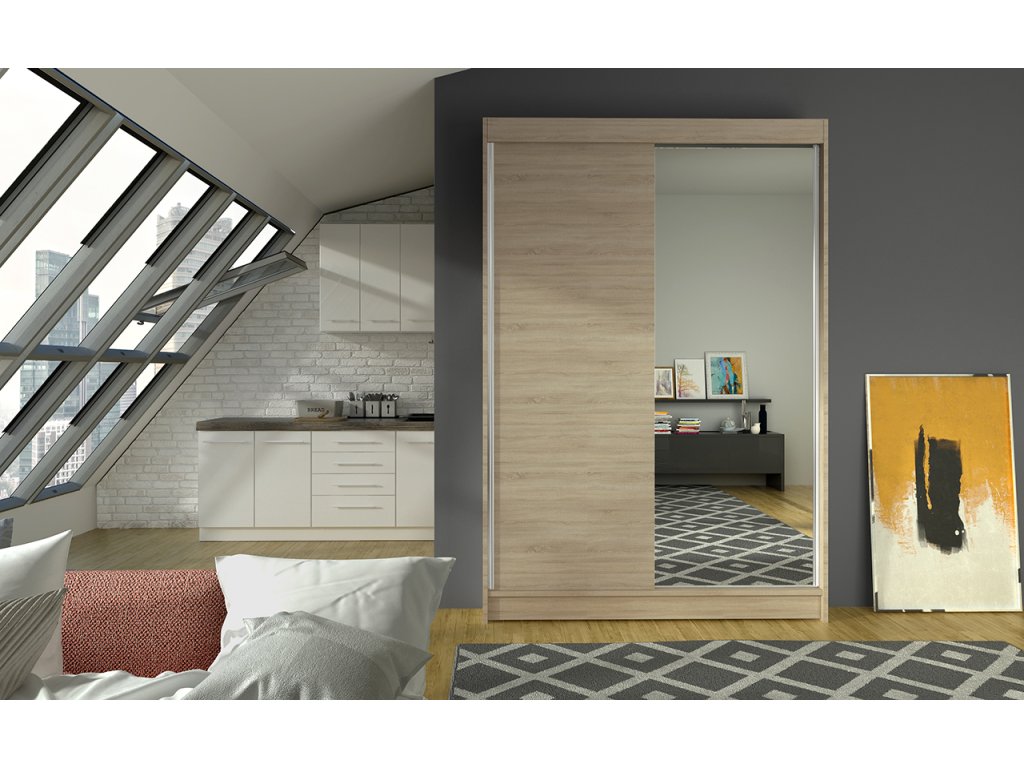 Skříň je vyrobena z kvalitního lamina. Díky svému vnitřnímu uspořádání nabízí dostatek úložného prostoru, posuvné dveře šetří prostor a zrcadlo ho opticky zvětšuje. Skříň je vhodná do ložnice, dětského nebo studentského pokoje, do předsíně i kanceláře. Vnitřní uspořádání skříně je vyobrazeno na fotografii. Skříň je dodávána v demontu. Součástí je i skleněné zrcadlo, které je nalepeno na jedné části dveří skříně a také montážní plánek včetně všech potřebných spojovacích materiálů. Vyobrazené dekorace nejsou v ceně.