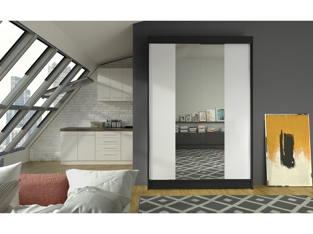 Skříň je vyrobena z kvalitního lamina. Díky svému vnitřnímu uspořádání nabízí dostatek úložného prostoru, posuvné dveře šetří prostor a zrcadlo ho opticky zvětšuje. Skříň je vhodná do ložnice, dětského nebo studentského pokoje, do předsíně i kanceláře. Vnitřní uspořádání skříně je vyobrazeno na fotografii. Skříň je dodávána v demontu. Součástí jsou i skleněná zrcadla, která jsou nalepena na dveřích skříně a také montážní plánek včetně všech potřebných spojovacích materiálů. Vyobrazené dekorace nejsou v ceně.