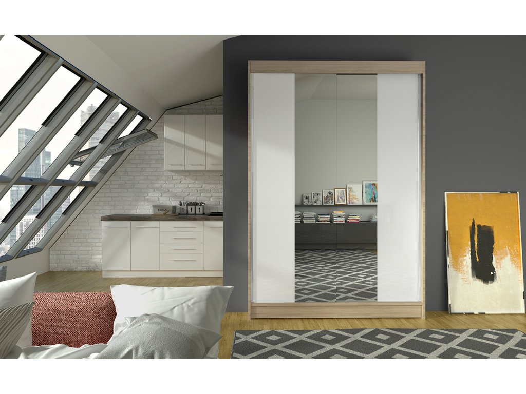 Skříň je vyrobena z kvalitního lamina. Díky svému vnitřnímu uspořádání nabízí dostatek úložného prostoru, posuvné dveře šetří prostor a zrcadlo ho opticky zvětšuje. Skříň je vhodná do ložnice, dětského nebo studentského pokoje, do předsíně i kanceláře. Vnitřní uspořádání skříně je vyobrazeno na fotografii. Skříň je dodávána v demontu. Součástí jsou i skleněná zrcadla, která jsou nalepena na dveřích skříně a také montážní plánek včetně všech potřebných spojovacích materiálů. Vyobrazené dekorace nejsou v ceně.