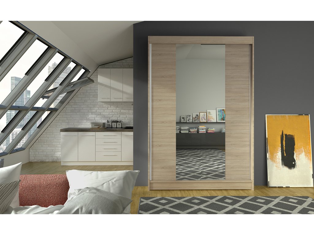 Skříň je vyrobena z kvalitního lamina. Díky svému vnitřnímu uspořádání nabízí dostatek úložného prostoru, posuvné dveře šetří prostor a zrcadlo ho opticky zvětšuje. Skříň je vhodná do ložnice, dětského nebo studentského pokoje, do předsíně i kanceláře. Vnitřní uspořádání skříně je vyobrazeno na fotografii. Skříň je dodávána v demontu. Součástí jsou i skleněná zrcadla, která jsou nalepena na dveřích skříně a také montážní plánek včetně všech potřebných spojovacích materiálů. Vyobrazené dekorace nejsou v ceně.
