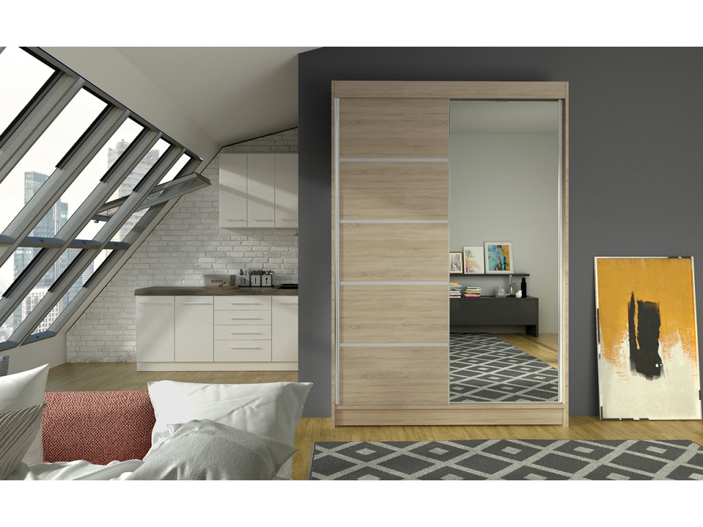 Skříň je vyrobena z kvalitního lamina. Díky svému vnitřnímu uspořádání nabízí dostatek úložného prostoru, posuvné dveře šetří prostor a zrcadlo ho opticky zvětšuje. Skříň je vhodná do ložnice, dětského nebo studentského pokoje, do předsíně i kanceláře. Vnitřní uspořádání skříně je vyobrazeno na fotografii. Skříň je dodávána v demontu. Součástí jsou i skleněná zrcadla, která jsou nalepena na dveřích skříně a také montážní plánek včetně všech potřebných spojovacích materiálů. Vyobrazené dekorace nejsou v ceně.