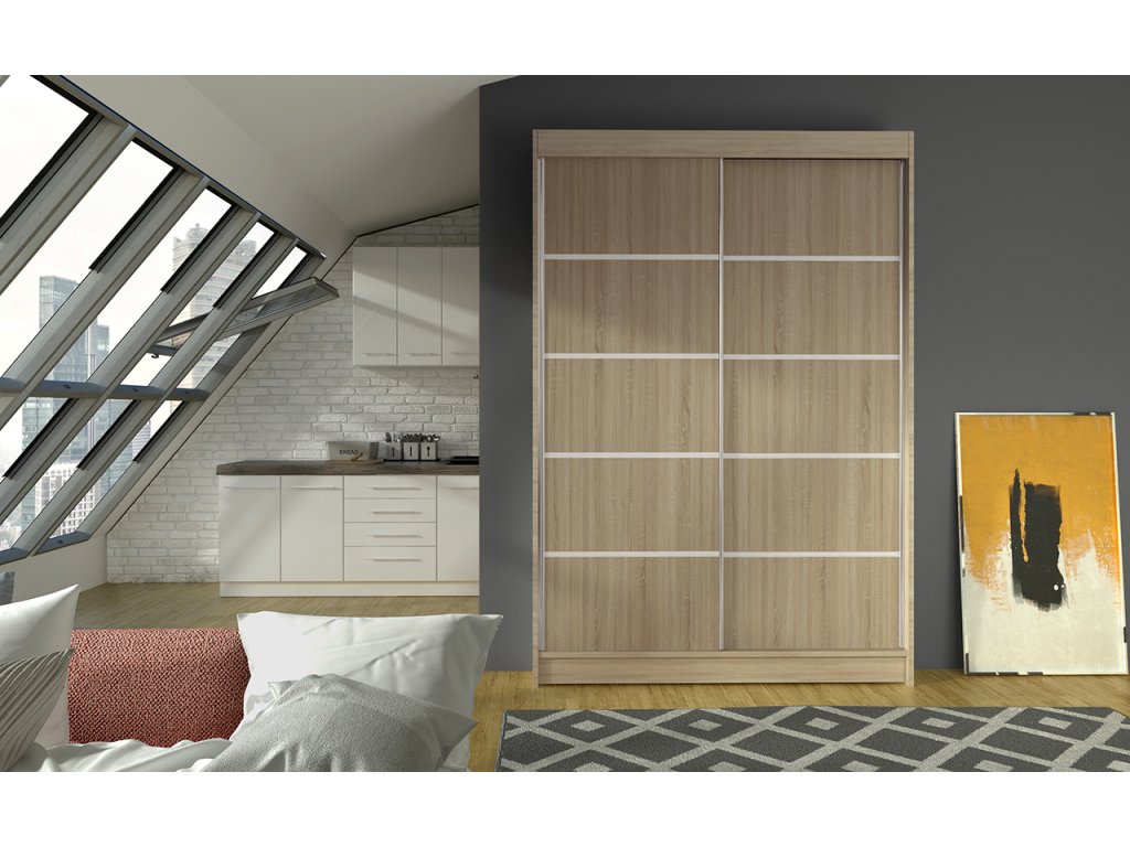 Skříň je vyrobena z kvalitního lamina. Díky svému vnitřnímu uspořádání nabízí dostatek úložného prostoru a posuvné dveře prostor šetří. Skříň je vhodná do ložnice, dětského nebo studentského pokoje, do předsíně i kanceláře. Vnitřní uspořádání skříně je vyobrazeno na fotografii. Skříň je dodávána v demontu a součástí je montážní plánek včetně všech potřebných spojovacích materiálů. Vyobrazené dekorace nejsou v ceně.