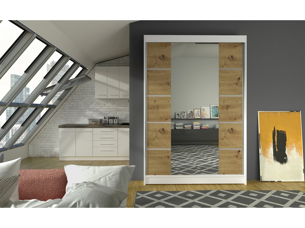 Skříň je vyrobena z kvalitního lamina. Díky svému vnitřnímu uspořádání nabízí dostatek úložného prostoru, posuvné dveře šetří prostor a zrcadlo ho opticky zvětšuje. Skříň je vhodná do ložnice, dětského nebo studentského pokoje, do předsíně i kanceláře. Vnitřní uspořádání skříně je vyobrazeno na fotografii. Skříň je dodávána v demontu. Součástí jsou i skleněná zrcadla, která jsou nalepena na dveřích skříně a také montážní plánek včetně všech potřebných spojovacích materiálů. Vyobrazené dekorace nejsou v ceně.