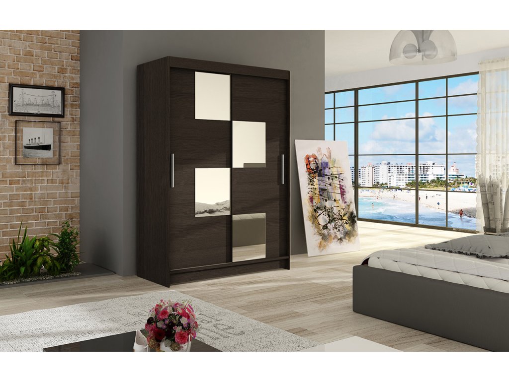 Moderní a elegantní design skříně osloví i náročné zákazníky. Eleganci podtrhují dlouhé stříbrné úchyty a moderní nádech dodávají zrcadla, která jsou nalepena na dveřích skříně. Je vyrobena z lamina o síle 16 mm a hrany jsou ukončeny ABS lištou. Vodící lišty jsou vyrobeny z odolného hliníku a splňují požadavky pro každodenní užívání. Díky svému uspořádání poskytuje dostatek úložného prostoru. Skvěle se hodí do ložnice, předsíně, dětského, nebo studentského pokoje. Skříň je dodávána v demontu a součástí je montážní plánek včetně všech potřebných spojovacích materiálů. Vyobrazené dekorace nejsou v ceně. Skleněná zrcadla jsou součástí skříně.