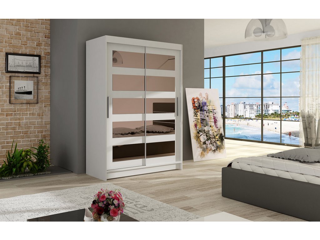 Moderní a elegantní design skříně osloví i náročné zákazníky. Eleganci podtrhují dlouhé stříbrné úchyty a moderní nádech dodávají kouřová zrcadla, která jsou nalepena na dveřích skříně. Je vyrobena z lamina o síle 16 mm a hrany jsou ukončeny ABS lištou. Vodící lišty jsou vyrobeny z odolného hliníku a splňují požadavky pro každodenní užívání. Díky svému uspořádání poskytuje dostatek úložného prostoru. Skvěle se hodí do ložnice, předsíně, dětského, nebo studentského pokoje. Skříň je dodávána v demontu a součástí je montážní plánek včetně všech potřebných spojovacích materiálů. Vyobrazené dekorace nejsou v ceně. Skleněná zrcadla jsou součástí skříně.