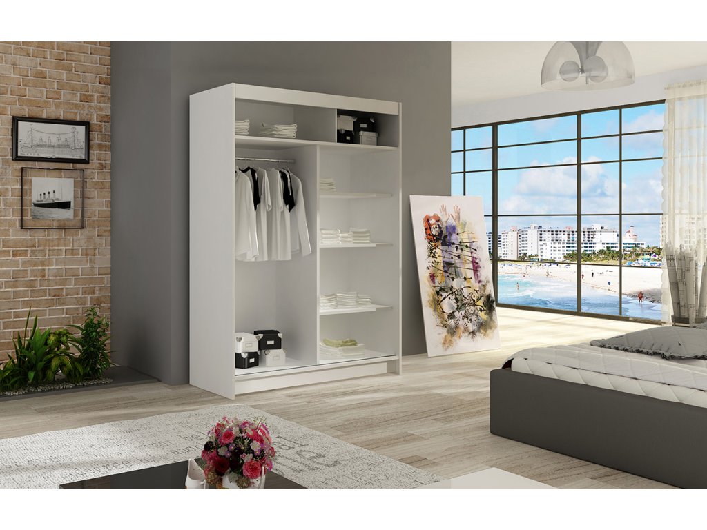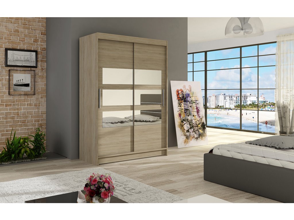 Moderní a elegantní design skříně osloví i náročné zákazníky. Eleganci podtrhují dlouhé stříbrné úchyty a moderní nádech dodávají zrcadla, která jsou nalepena na dveřích skříně. Je vyrobena z lamina o síle 16 mm a hrany jsou ukončeny ABS lištou. Vodící lišty jsou vyrobeny z odolného hliníku a splňují požadavky pro každodenní užívání. Díky svému uspořádání poskytuje dostatek úložného prostoru. Skvěle se hodí do ložnice, předsíně, dětského, nebo studentského pokoje. Skříň je dodávána v demontu a součástí je montážní plánek včetně všech potřebných spojovacích materiálů. Vyobrazené dekorace nejsou v ceně. Skleněná zrcadla jsou součástí skříně.