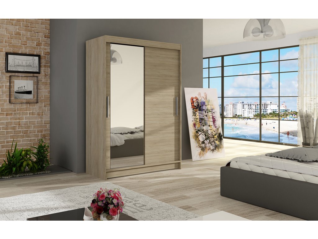 Moderní a elegantní design skříně osloví i náročné zákazníky. Eleganci podtrhují dlouhé stříbrné úchyty a zrcadla na dveřích skříně. Je vyrobena z lamina o síle 16 mm a hrany jsou ukončeny ABS lištou. Vodící lišty jsou vyrobeny z odolného hliníku a splňují požadavky pro každodenní užívání. Díky svému uspořádání poskytuje dostatek úložného prostoru. Skvěle se hodí do ložnice, předsíně, dětského, nebo studentského pokoje. Skříň je dodávána v demontu a součástí je montážní plánek včetně všech potřebných spojovacích materiálů. Vyobrazené dekorace nejsou v ceně. Součástí je i skleněné zrcadlo, které je nalepeno na jedné části dveří skříně.