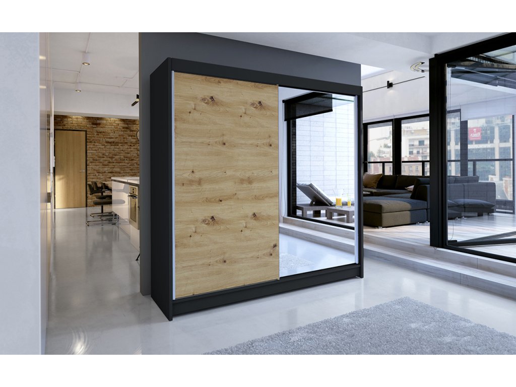 Skříň je vyrobena z kvalitního lamina. Díky svému vnitřnímu uspořádání nabízí dostatek úložného prostoru, posuvné dveře šetří prostor a zrcadlo ho opticky zvětšuje. Skříň je vhodná do ložnice, dětského nebo studentského pokoje, do předsíně i kanceláře. Vnitřní uspořádání skříně je vyobrazeno na fotografii. Skříň je dodávána v demontu. Součástí je i skleněné zrcadlo, které je nalepeno na jedné části dveří skříně a také montážní plánek včetně všech potřebných spojovacích materiálů. Vyobrazené dekorace nejsou v ceně.