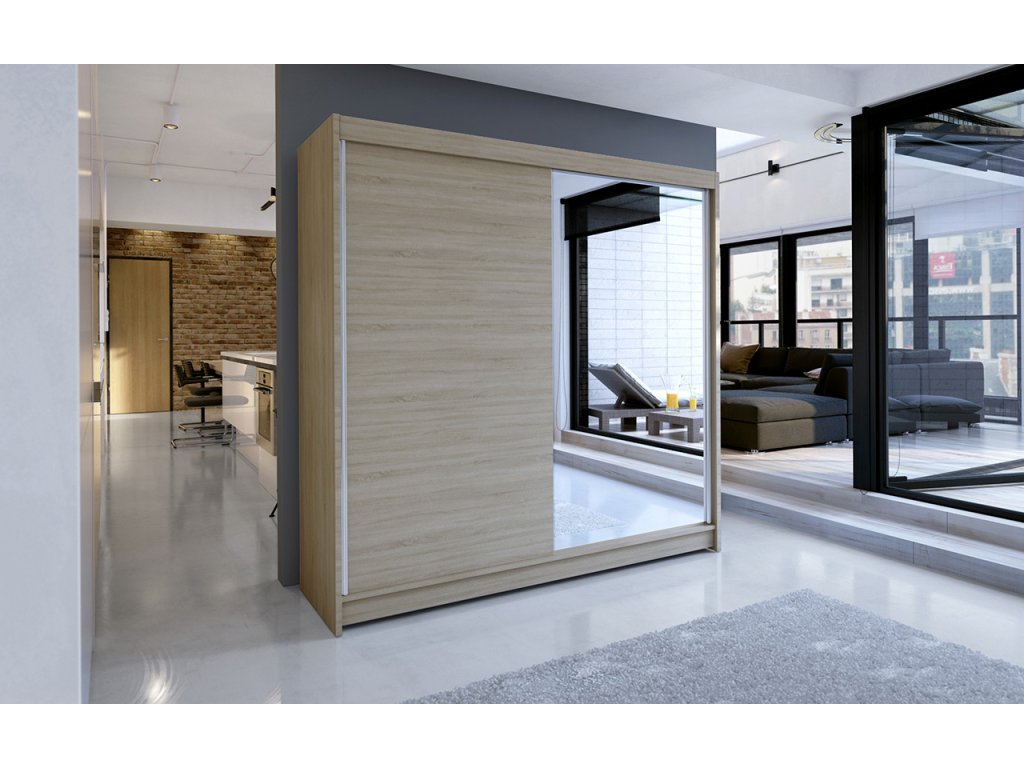 Skříň je vyrobena z kvalitního lamina. Díky svému vnitřnímu uspořádání nabízí dostatek úložného prostoru, posuvné dveře šetří prostor a zrcadlo ho opticky zvětšuje. Skříň je vhodná do ložnice, dětského nebo studentského pokoje, do předsíně i kanceláře. Vnitřní uspořádání skříně je vyobrazeno na fotografii. Skříň je dodávána v demontu. Součástí je i skleněné zrcadlo, které je nalepeno na jedné části dveří skříně a také montážní plánek včetně všech potřebných spojovacích materiálů. Vyobrazené dekorace nejsou v ceně.