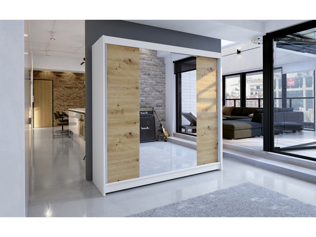 Skříň je vyrobena z kvalitního lamina. Díky svému vnitřnímu uspořádání nabízí dostatek úložného prostoru, posuvné dveře šetří prostor a zrcadlo ho opticky zvětšuje. Skříň je vhodná do ložnice, dětského nebo studentského pokoje, do předsíně i kanceláře. Vnitřní uspořádání skříně je vyobrazeno na fotografii. Skříň je dodávána v demontu. Součástí jsou i skleněná zrcadla, která jsou nalepena na dveřích skříně a také montážní plánek včetně všech potřebných spojovacích materiálů. Vyobrazené dekorace nejsou v ceně.