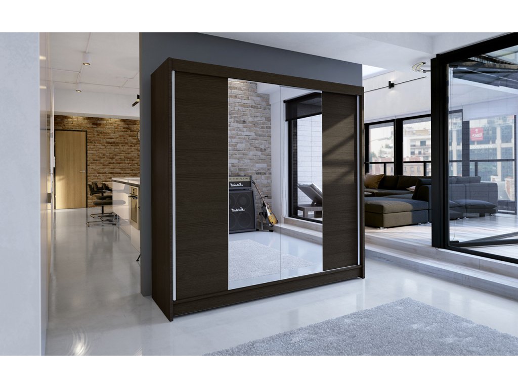 Skříň je vyrobena z kvalitního lamina. Díky svému vnitřnímu uspořádání nabízí dostatek úložného prostoru, posuvné dveře šetří prostor a zrcadlo ho opticky zvětšuje. Skříň je vhodná do ložnice, dětského nebo studentského pokoje, do předsíně i kanceláře. Vnitřní uspořádání skříně je vyobrazeno na fotografii. Skříň je dodávána v demontu. Součástí jsou i skleněná zrcadla, která jsou nalepena na dveřích skříně a také montážní plánek včetně všech potřebných spojovacích materiálů. Vyobrazené dekorace nejsou v ceně.