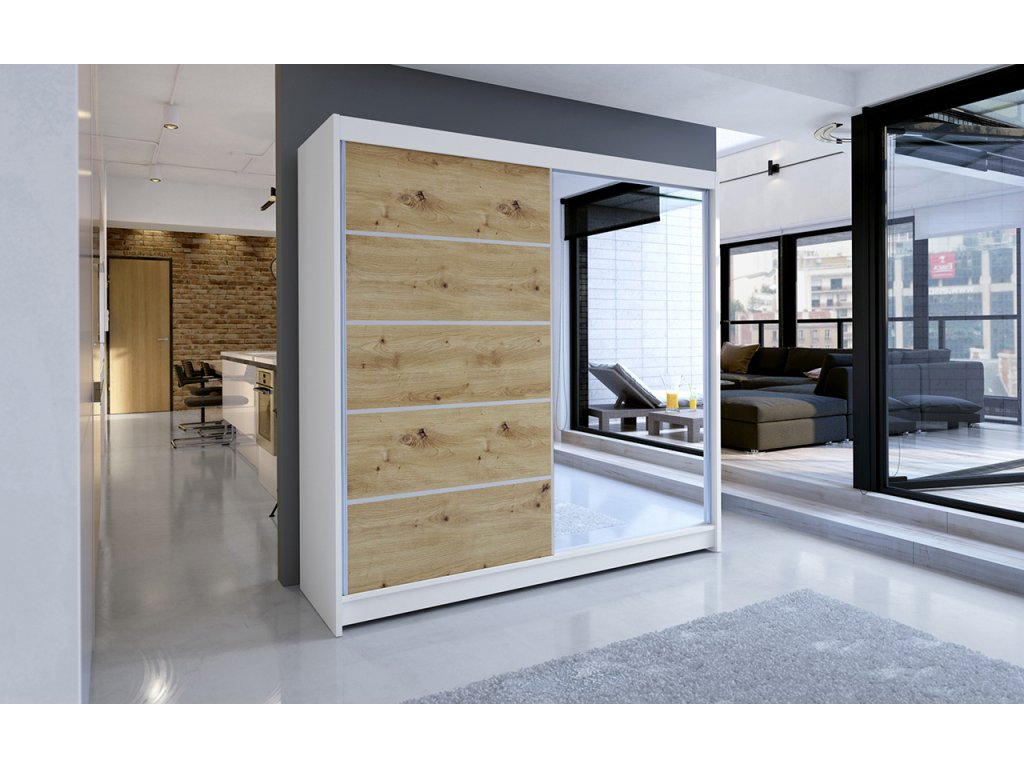 Skříň je vyrobena z kvalitního lamina. Díky svému vnitřnímu uspořádání nabízí dostatek úložného prostoru, posuvné dveře šetří prostor a zrcadlo ho opticky zvětšuje. Skříň je vhodná do ložnice, dětského nebo studentského pokoje, do předsíně i kanceláře. Vnitřní uspořádání skříně je vyobrazeno na fotografii. Skříň je dodávána v demontu. Součástí je i skleněné zrcadlo, které je nalepeno na jedné části dveří skříně a také montážní plánek včetně všech potřebných spojovacích materiálů. Vyobrazené dekorace nejsou v ceně.