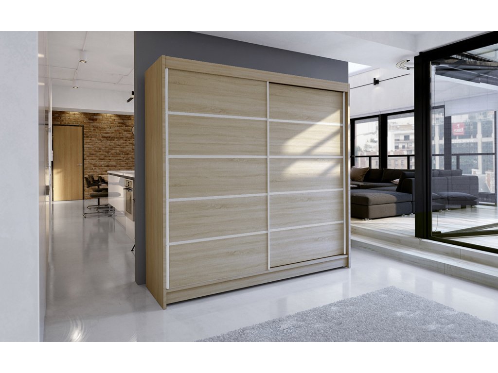 Skříň je vyrobena z kvalitního lamina. Díky svému vnitřnímu uspořádání nabízí dostatek úložného prostoru a posuvné dveře prostor šetří. Skříň je vhodná do ložnice, dětského nebo studentského pokoje, do předsíně i kanceláře. Vnitřní uspořádání skříně je vyobrazeno na fotografii. Skříň je dodávána v demontu a součástí je montážní plánek včetně všech potřebných spojovacích materiálů. Vyobrazené dekorace nejsou v ceně.