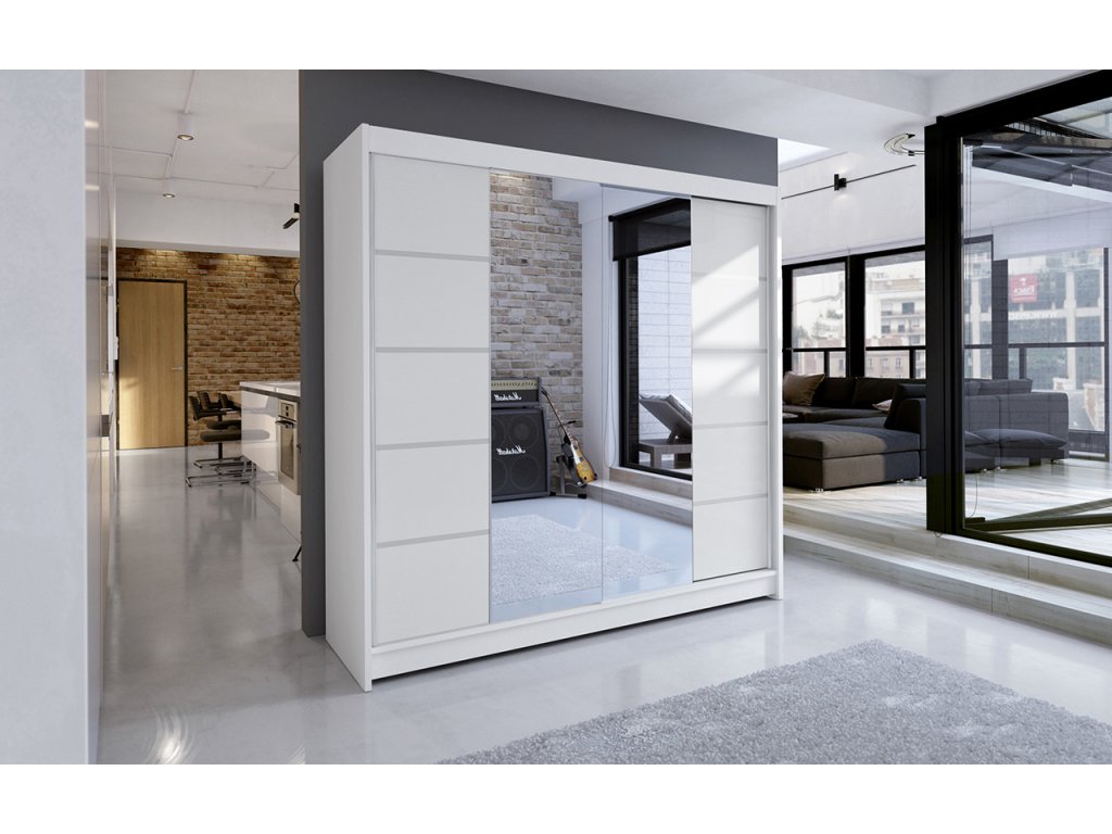 Skříň je vyrobena z kvalitního lamina. Díky svému vnitřnímu uspořádání nabízí dostatek úložného prostoru, posuvné dveře šetří prostor a zrcadlo ho opticky zvětšuje. Skříň je vhodná do ložnice, dětského nebo studentského pokoje, do předsíně i kanceláře. Vnitřní uspořádání skříně je vyobrazeno na fotografii. Skříň je dodávána v demontu. Součástí jsou i skleněná zrcadla, která jsou nalepena na dveřích skříně a také montážní plánek včetně všech potřebných spojovacích materiálů. Vyobrazené dekorace nejsou v ceně.