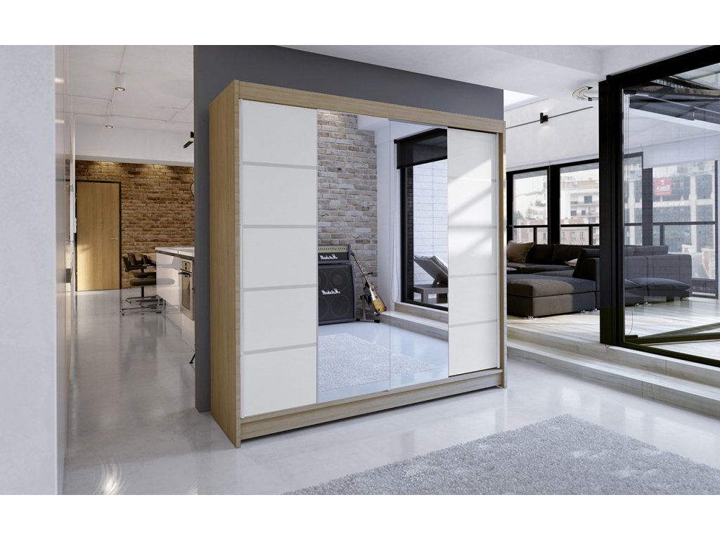 Skříň je vyrobena z kvalitního lamina. Díky svému vnitřnímu uspořádání nabízí dostatek úložného prostoru, posuvné dveře šetří prostor a zrcadlo ho opticky zvětšuje. Skříň je vhodná do ložnice, dětského nebo studentského pokoje, do předsíně i kanceláře. Vnitřní uspořádání skříně je vyobrazeno na fotografii. Skříň je dodávána v demontu. Součástí jsou i skleněná zrcadla, která jsou nalepena na dveřích skříně a také montážní plánek včetně všech potřebných spojovacích materiálů. Vyobrazené dekorace nejsou v ceně.