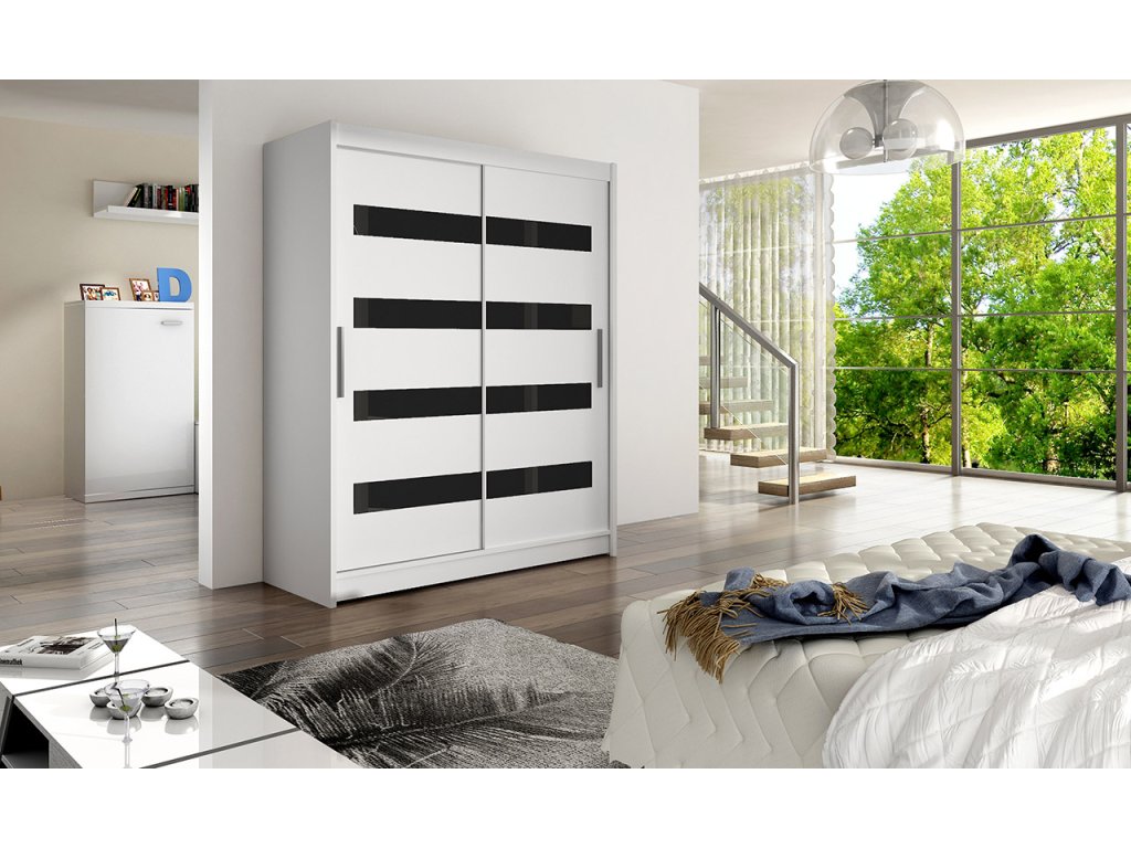 Moderní a elegantní design skříně osloví i náročné zákazníky. Eleganci podtrhují dlouhé stříbrné úchyty a moderní nádech dodává kombinace bílé s černými pruhy na dveřích skříně. Je vyrobena z lamina o síle 16 mm a hrany jsou ukončeny ABS lištou. Vodící lišty jsou vyrobeny z odolného hliníku a splňují požadavky pro každodenní užívání. Díky svému uspořádání poskytuje dostatek úložného prostoru. Skvěle se hodí do ložnice, předsíně, dětského, nebo studentského pokoje. Skříň je dodávána v demontu a součástí je montážní plánek včetně všech potřebných spojovacích materiálů. Vyobrazené dekorace nejsou v ceně.