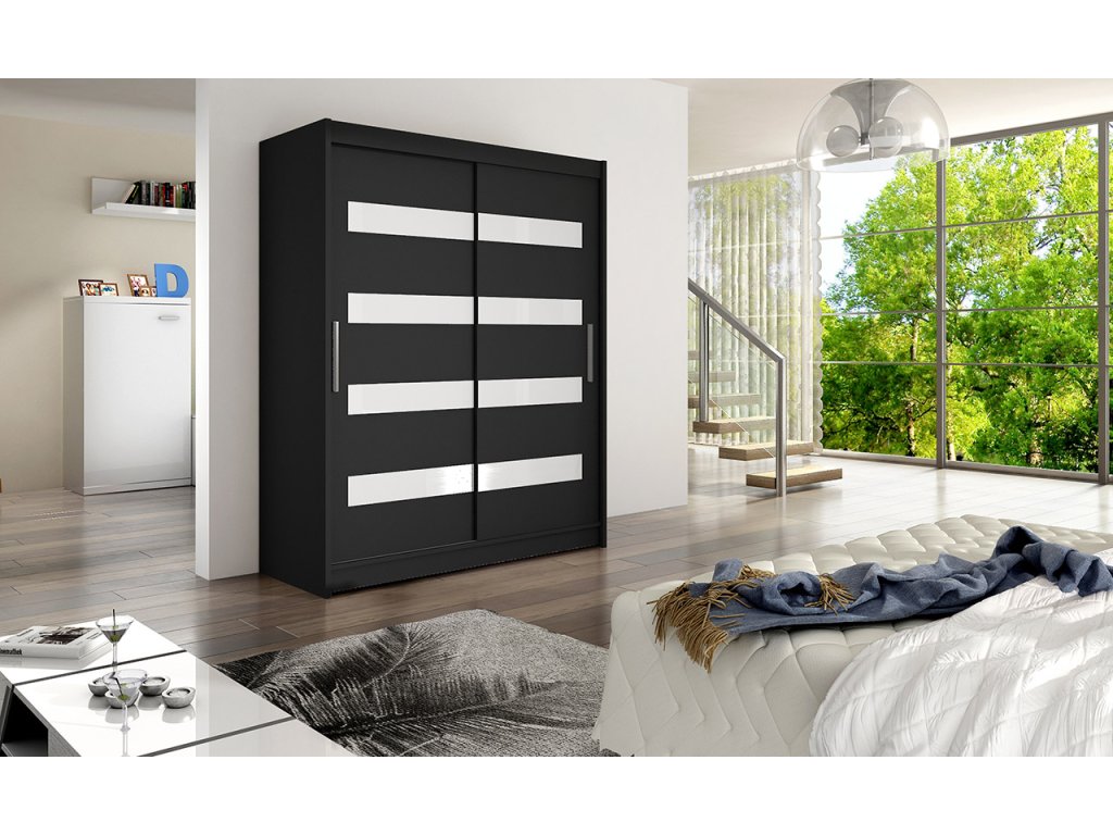 Moderní a elegantní design skříně osloví i náročné zákazníky. Eleganci podtrhují dlouhé stříbrné úchyty a moderní nádech dodává kombinace černé s bílými pruhy na dveřích skříně. Je vyrobena z lamina o síle 16 mm a hrany jsou ukončeny ABS lištou. Vodící lišty jsou vyrobeny z odolného hliníku a splňují požadavky pro každodenní užívání. Díky svému uspořádání poskytuje dostatek úložného prostoru. Skvěle se hodí do ložnice, předsíně, dětského, nebo studentského pokoje. Skříň je dodávána v demontu a součástí je montážní plánek včetně všech potřebných spojovacích materiálů. Vyobrazené dekorace nejsou v ceně.