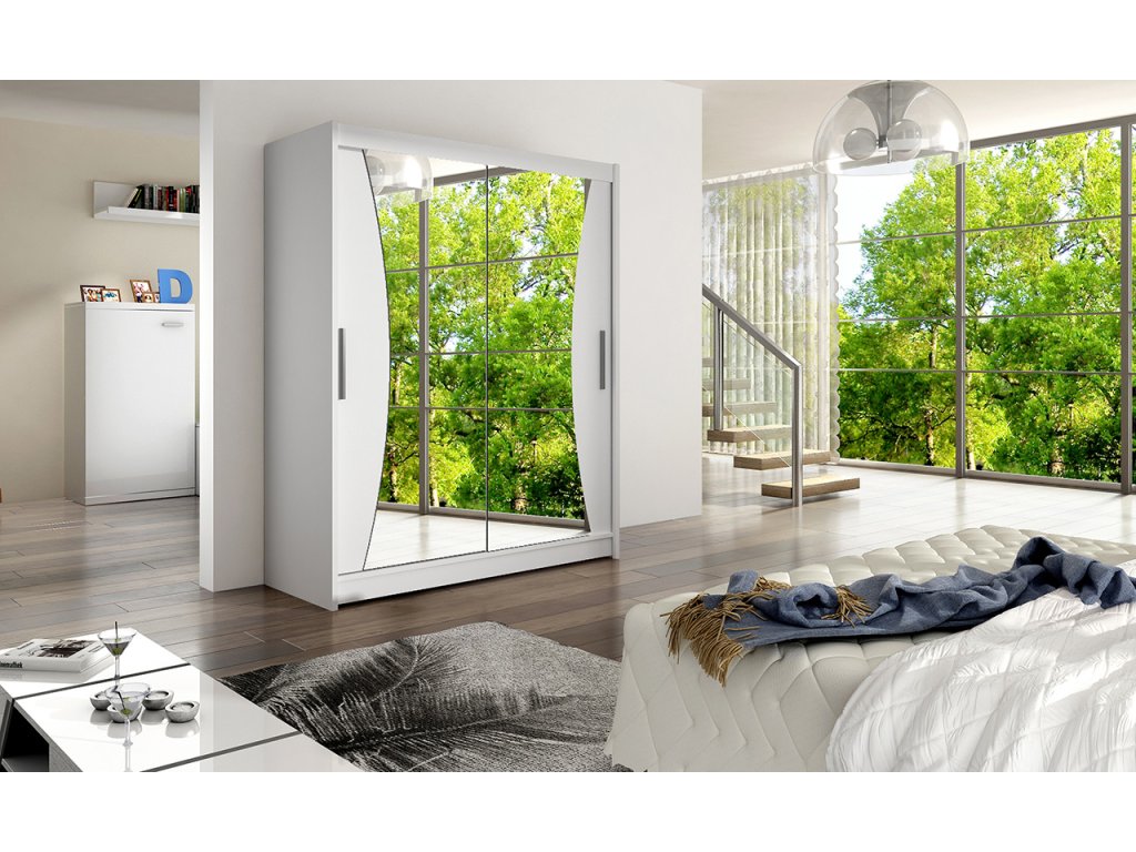Jednoduchý a elegantní design skříně osloví i náročné zákazníky. Eleganci podtrhují dlouhé stříbrné úchyty a součástí jsou i skleněná zrcadla, která jsou nalepena na dveřích skříně a po stranách zaříznutá do oblouku. Je vyrobena z lamina o síle 16 mm a hrany jsou ukončeny ABS lištou. Vodící lišty jsou vyrobeny z odolného hliníku a splňují požadavky pro každodenní užívání. Díky svému uspořádání poskytuje dostatek úložného prostoru a zrcadlo prostor opticky zvětší a prosvětlí. Skvěle se hodí do ložnice, předsíně, dětského, nebo studentského pokoje. Skříň je dodávána v demontu a součástí je montážní plánek včetně všech potřebných spojovacích materiálů. Vyobrazené dekorace nejsou v ceně.