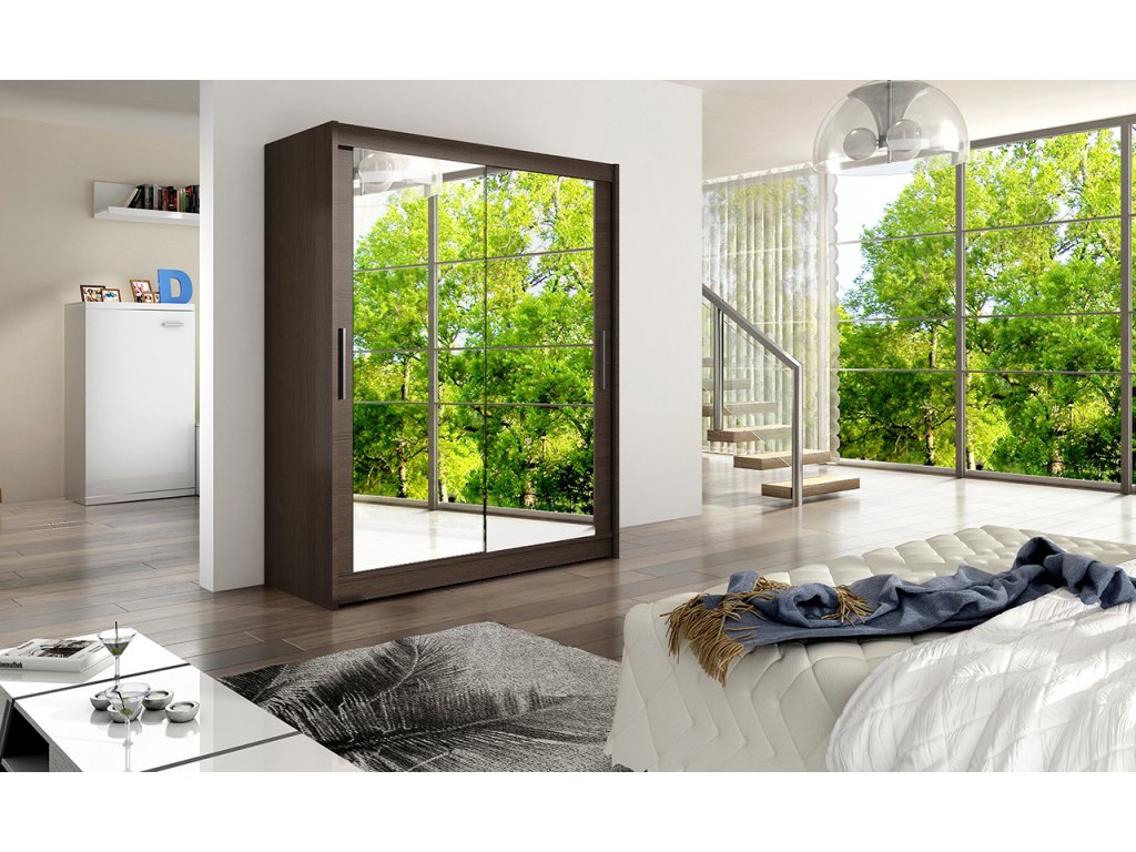 Jednoduchý a zárověň elegantní design skříně osloví i náročné zákazníky. Eleganci podtrhují dlouhé stříbrné úchyty a součástí jsou i velká skleněná zrcadla, která jsou nalepena na dveřích skříně. Je vyrobena z lamina o síle 16 mm a hrany jsou ukončeny ABS lištou. Vodící lišty jsou vyrobeny z odolného hliníku a splňují požadavky pro každodenní užívání. Díky svému uspořádání poskytuje dostatek úložného prostoru. Skvěle se hodí do ložnice, předsíně, dětského, nebo studentského pokoje. Skříň je dodávána v demontu a součástí je montážní plánek včetně všech potřebných spojovacích materiálů. Vyobrazené dekorace nejsou v ceně.