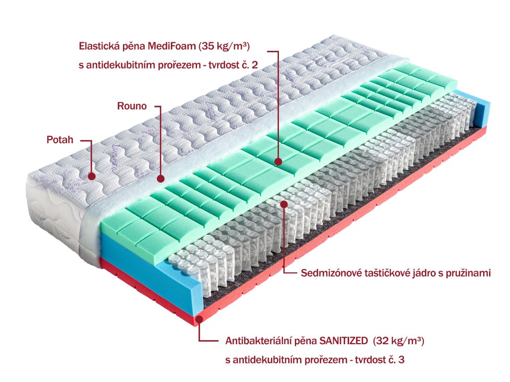 Jedná se o komfortní matraci s dvojí tuhostí a vynikajícími ortopedickými vlastnostmi. Vrchní tyrkysově zelená vrstva je tvořena elastickou pěnou MediFoam (35 kg/m³), která má tuhost č. 2. Pevnější červená pěna (32 kg/m³) má antibakteriální úpravu Sanitized s trvalou ochranou proti bakteriím, tuhost č. 3. Obě pěny mají antidekubitní prořez, takže se ideálně tvarují podle každé polohy těla. Taštičkové jádro vytváří maximální komfort pro perfektní odpočinek a spánek. Hlavní předností taštičkových matrací je jejich vzdušnost a dokonalé kopírování tvaru páteře. Matrace může být položena na všechny typy roštů, dokonce i na pevnou desku nebo motorový rošt.