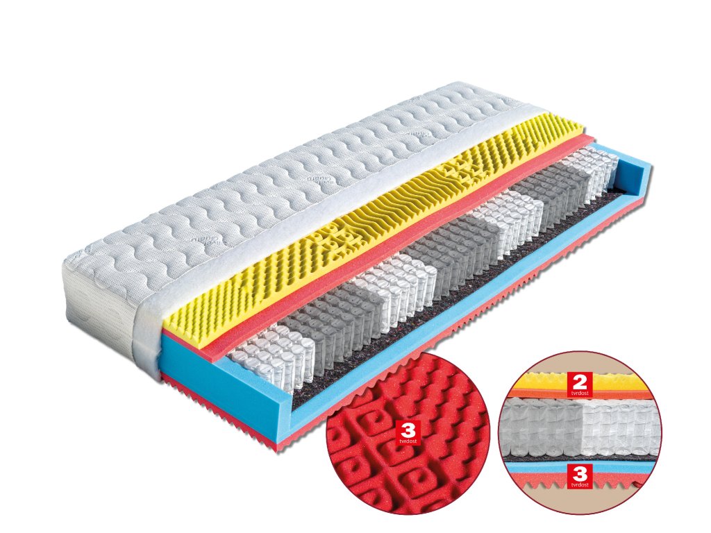 Taštičková matrace s jádrem obsahujícím velké množství pružinek zabalených do textilních pouzder. Vrchní vrstvy tvoří pěny dvou tuhostí s antibakteriální úpravou Sanitized, která poskytuje trvalou a účinnou ochranu proti bakteriím, roztočům a plísním. Tyto pěny jsou podloženy roznášecí vrstvou ve výšce 2 cm pro vyšší komfort. Červená pěna (32 kg/m³) tvarovaná do masážních nopů tvoří tvrdší stranu, tvrdost č. 3. Druhá pěna limetkové barvy (40 kg/m³) tvarovaná do masážních nopů má tvrdost č. 2. Matrace je vhodná pro alergiky. Může být položena na všechny typy roštů, dokonce i na pevnou desku nebo motorový rošt.