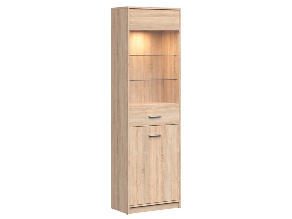 Vysoká vitrína NEPO PLUS vám nabízí moderní místo k vystavení vašich dekorací. Díky tomuto nábytku můžete všem ukázat rodinné fotografie, nebo porcelán po babičce. Vitrína NEPO PLUS je vyrobená z lamina v barvě dub sonoma. Ve vrchní části se nacházejí police. Díky tomu, že jsou k dispozici skleněné police, je vhodné přikoupit do vitríny také přídavné LED osvětlení, které vystavené předměty krásně osvítí. Spodní část je rovněž policová. Pro snadnější otevírání dvířek jsou na vitríně upevněny plastové úchytky stříbrné barvy. Dvířka je možné upevnit s otevíráním vlevo/vpravo. Dodáváno v demontu.