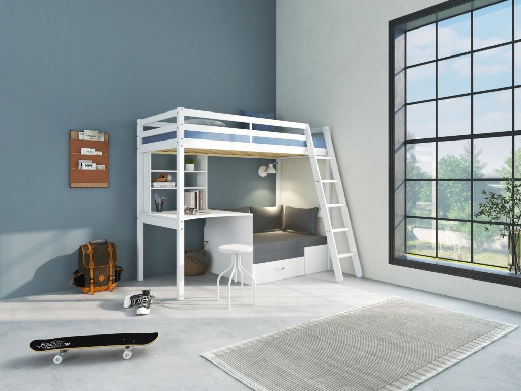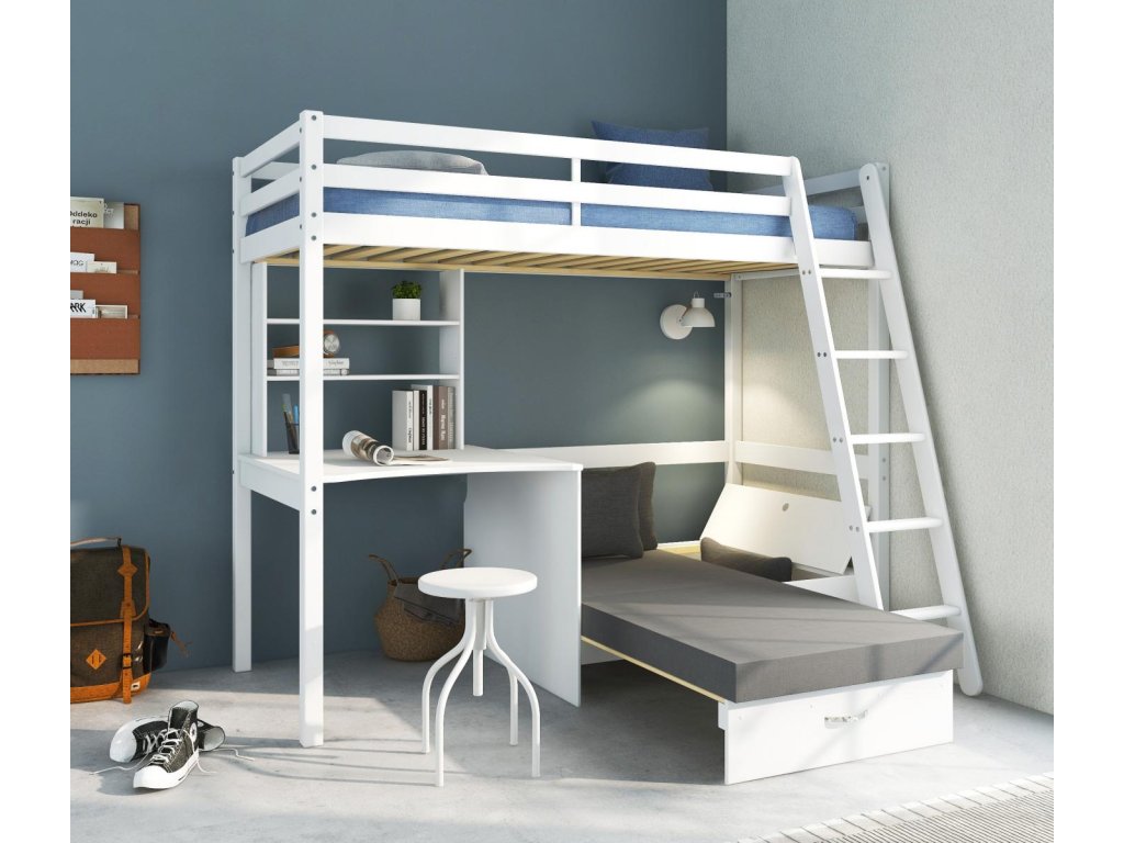 Vysoká postel s psacím stolem a rozkl. pohovkou Actim bílá