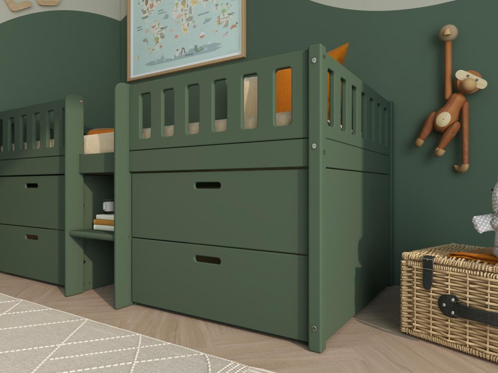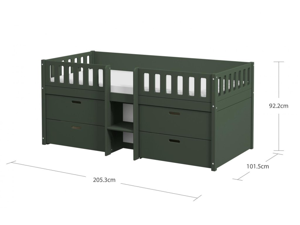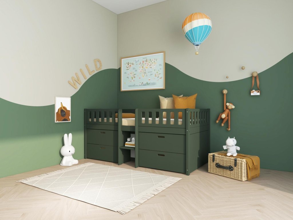 Vyvýšená postel se 4 zásuvkami a výškou 92 cm je dokonalým přechodem z dětské postele. Postel poskytuje útulné a bezpečné místo na spaní, zatímco zásuvky a police pod ní spoustu prostoru pro uložení hraček a oblečení. Přední bezpečnostní lištu lze později odstranit.