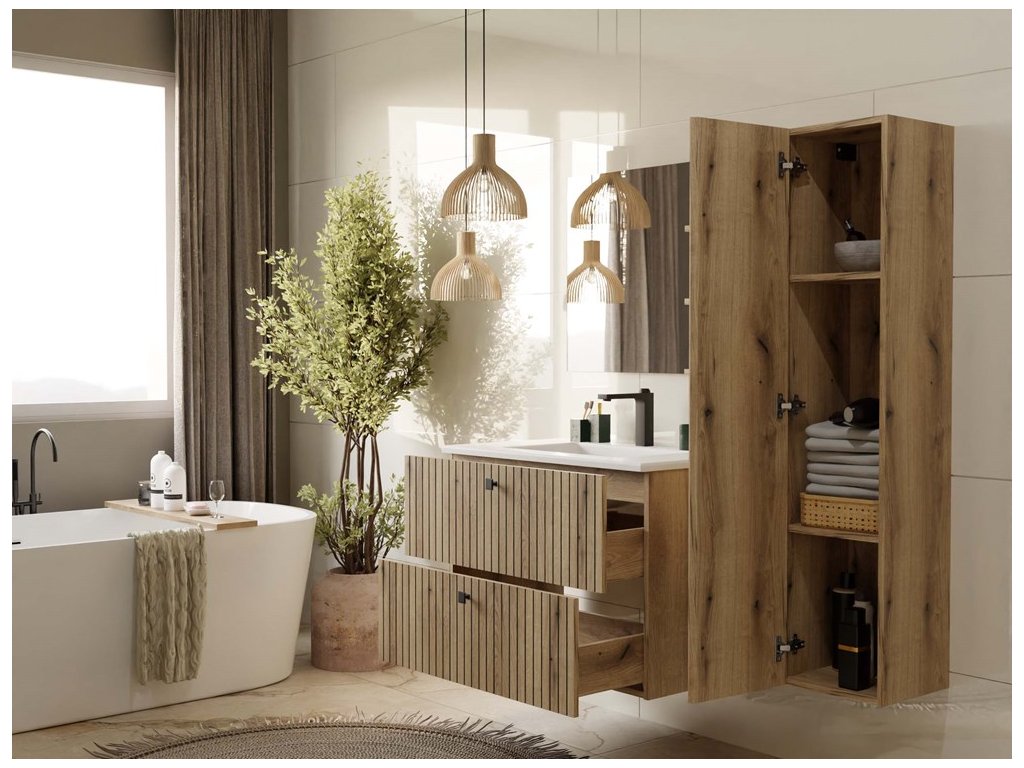 Objevte umyvadlovou skříňku Torio – elegantní spojení funkčnosti a moderního designu pro vaši koupelnu. Teplý odstín dubu evoke a drážkovaný povrch čela dodávají nábytku jedinečný styl. Promyšlené vnitřní uspořádání zásuvek se systémem pomalého dovírání a s výřezem pro sifon umožňuje optimální využití prostoru.
